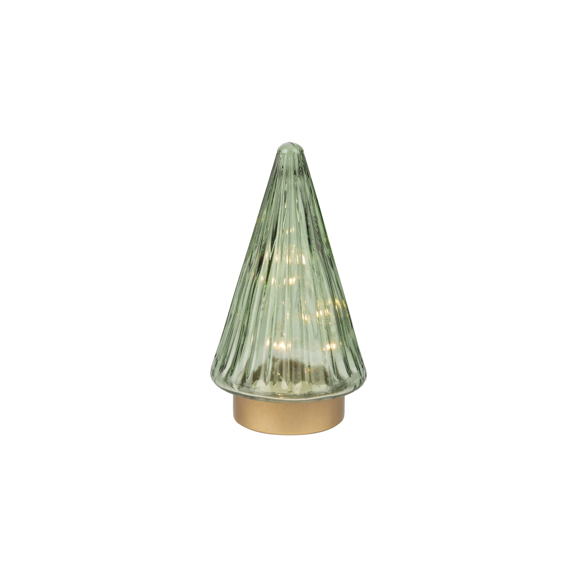 Glass cone tree table piece, LED light, green textured glass on gold metal base, 7.75 in.  The price listed is PER item, with a minimum purchase quantity of 6 items. While we aim for consistency, there may be slight variations in color between the product and the images provided, as well as among individual items. However, we take steps to ensure that these differences remain minimal. MATERIAL: Glass, Metal.  REQUIRED: 2 AAA BATTERIES NOT INCLUDED