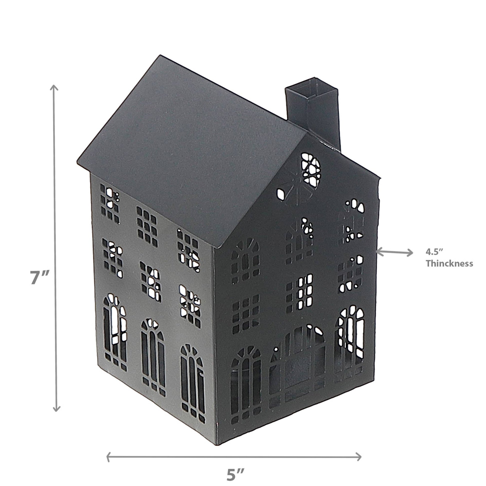 Create a warm and inviting ambiance with the Black Metal House Tealight Holder (Medium). Designed to bring a cozy and elegant touch to your home décor, this charming house-shaped tealight holder features a delicate cutout design that allows candlelight to flicker beautifully through its windows and roof. Made from durable iron and finished in a crisp black colour, this tea light candle holder offers a modern yet timeless aesthetic that complements any space. Whether used as a tabletop centerpiece, mantel accent, or festive decoration, this tealight holder adds a soft, glowing charm to your home.    Highlighted Features:  ?  Features: This house-shaped tealight holder features an intricate cutout design, allowing warm candlelight to shine through.
