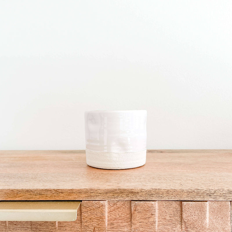 A luminous glossy top with a sandy-textured base, echoing nature's harmony right in your sanctuary. Its sheen accentuates your succulents, ferns, or any prized plants, letting their beauty shine unreservedly. Dimensions: 5" Dia x 4.25" H